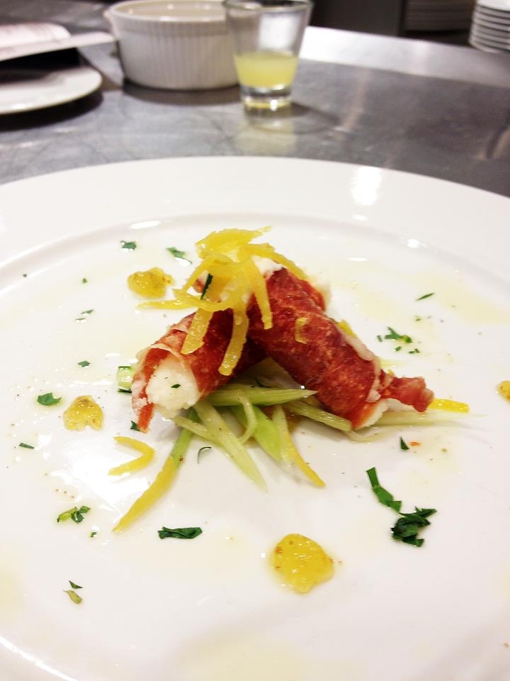 Aperi-Smile: Cannolo croccante di prosciutto di San Daniele con spuma di formaggio Grana Padano – confettura di fichi e limoni canditi Ingredienti per 4 persone: